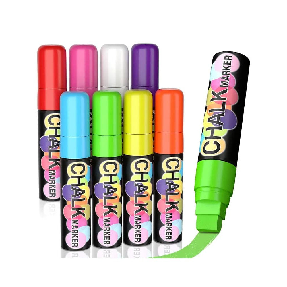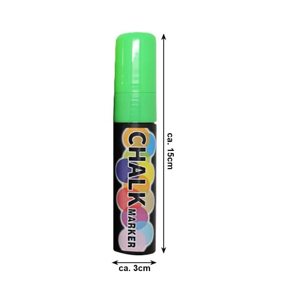 Set mit 8 Kreidemarkern auf Wasserbasis, jetzt mit dicker Spitze für kräftige Beschriftungen, günstig online bestellbar. Diese Kreidestifte sind geeignet für alle nicht porösen Oberflächen wie z.B. Kundenstopper, Kreidetafeln, Boards, Glas, etc. Mit einer Strichbreite von 7-15mm lassen sich auffällige Schriften und Zeichnungen gestalten, die sich mit Wasser oder einem feuchten Lappen wieder abwischen lassen. Alternativ haben wir auch wasserfeste Kreidemarker für Sie zusammengestellt, welche Sie >>hier bestellen können.