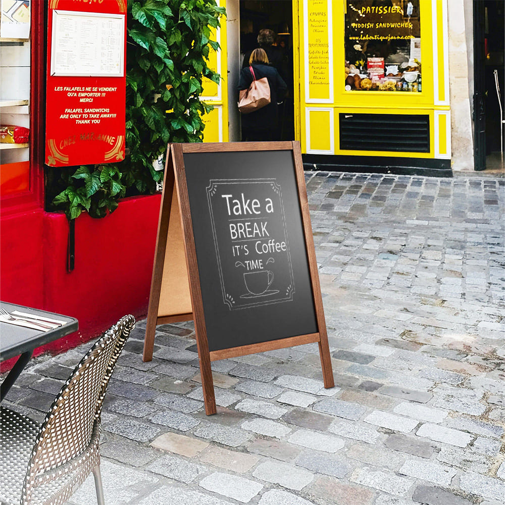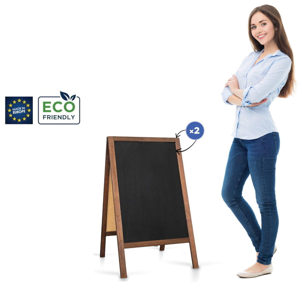 Dieser elegante Aufsteller kombiniert ein stabiles Holzgestell mit einer beschreibbaren Kreidetafel (66x44 cm), die du ganz einfach mit Kreide oder Kreidemarkern gestalten kannst. Ideal für Gastronomiebetriebe, Ladenbesitzer, Events, Hochzeiten oder sogar als kreative Malfläche für Kinder.
