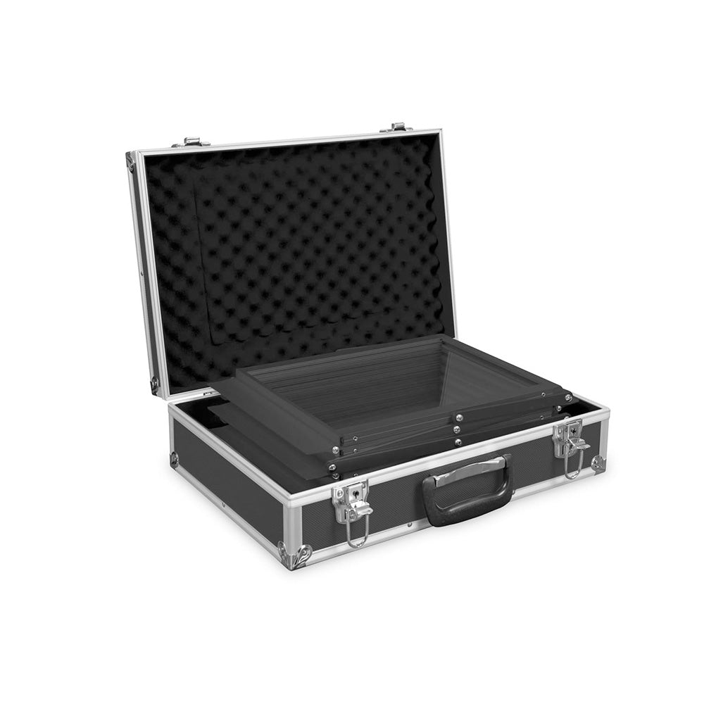Der Prospektständer lässt sich in wenigen Sekunden komplett zusammenklappen, besitzt ein sehr kleines Faltmass und wird inklusive stabilem Aluminiumkoffer mit Schaumstoffpolsterung geliefert – perfekt für den sicheren Transport und mobile Einsätze.