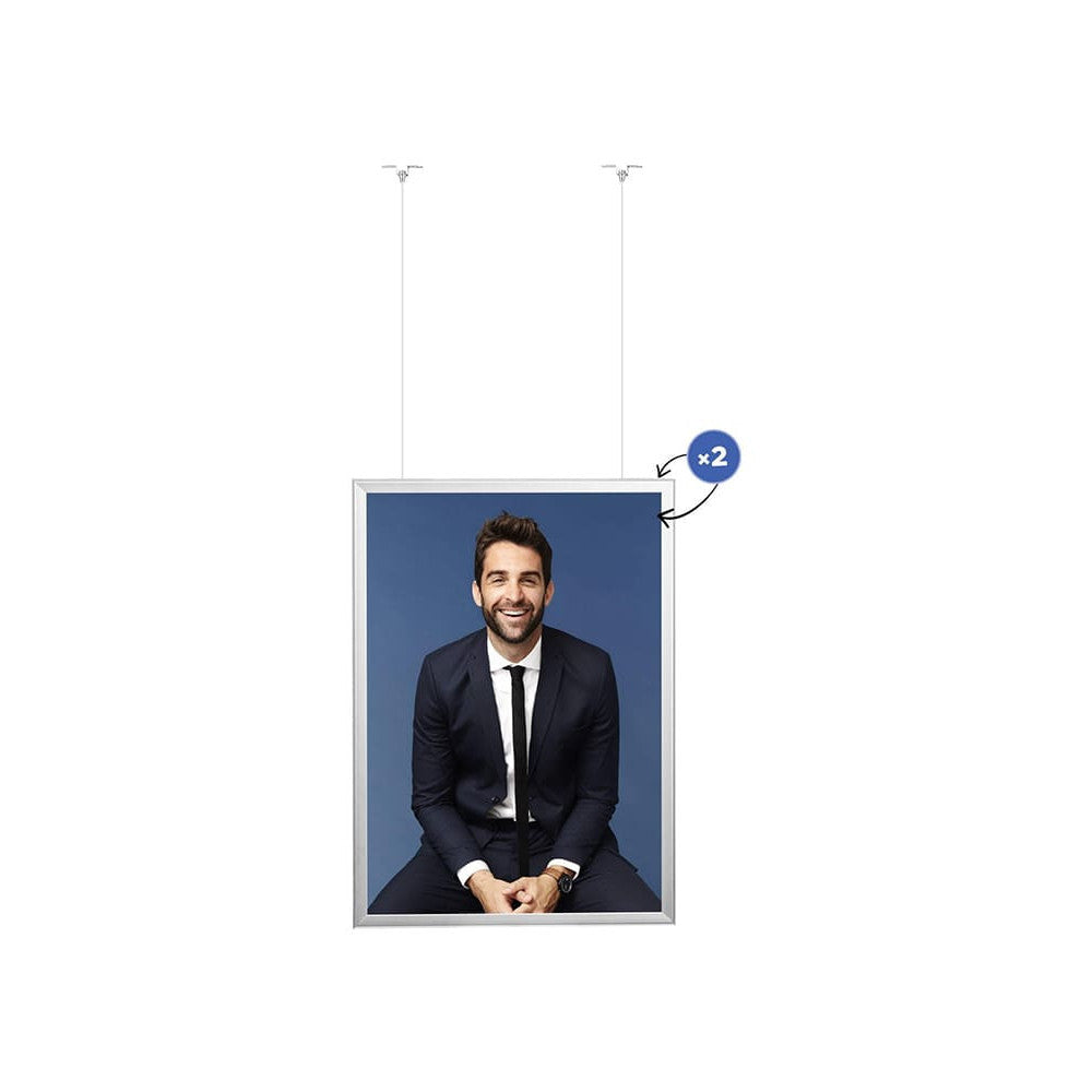 Beidseitiger Alu Klapprahmen hängend - die perfekte Lösung für Einkaufszentren und Geschäfte allerlei. Der Rahmen vom Typ Premium ermöglicht die Präsentation von Grafiken auf beiden Seiten. Das „Clip-Clap“-System ist weitläufig bekannt und bietet einen schnellen und problemlosen Austausch der Plakate, der nur wenige Sekunden dauert. Ein starkes Stahlseil garantiert eine sichere und stabile Aufhängung des Rahmens. Das Set enthält Halterungen zur Befestigung des Rahmens an der Decke. Die dicke Hülle, die das Bild / Poster bedeckt, hat einen UV-Filter, der vor dem Ausbleichen schützt. Der Rahmen ist aus eloxiertem Aluminium mit 32mm Profil gefertigt.