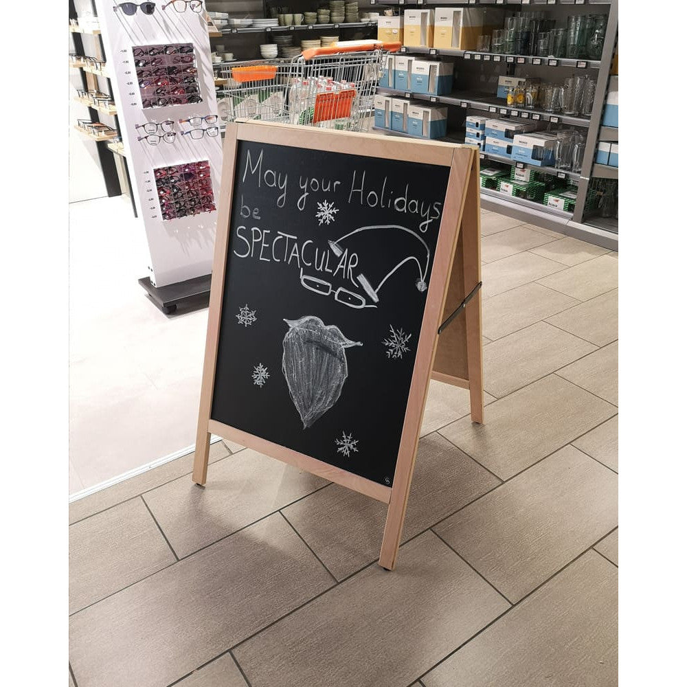 Holzaufsteller in Buche für das Präsentieren von Öffnungszeiten, Menüs, Angeboten, Specials, etc. Ob im Innen- oder geschützten Aussenbereich - Dieser Holz Kundenstopper ist ein Allrounder in Sachen Beschriftung mittels Kreidemarker & Folie. Seine Aufstellgrösse beträgt 105x68cm und ist auffällig genug, um Kunden in den Laden hinein zu bitten oder im Laden Angebote anzupreisen. Die beschriftbare Kreidetafel hat ein Format von 78x59cm und lässt sich mit Kreide, Kreidemarker sowie Folie beschriften. Vorzugsweise empfehlen wir eine Beschriftung mit unseren Securit Kreidemarker, da diese optimal dafür geeignet sind. Passende Kreidemarker & Zubehör können Sie >>