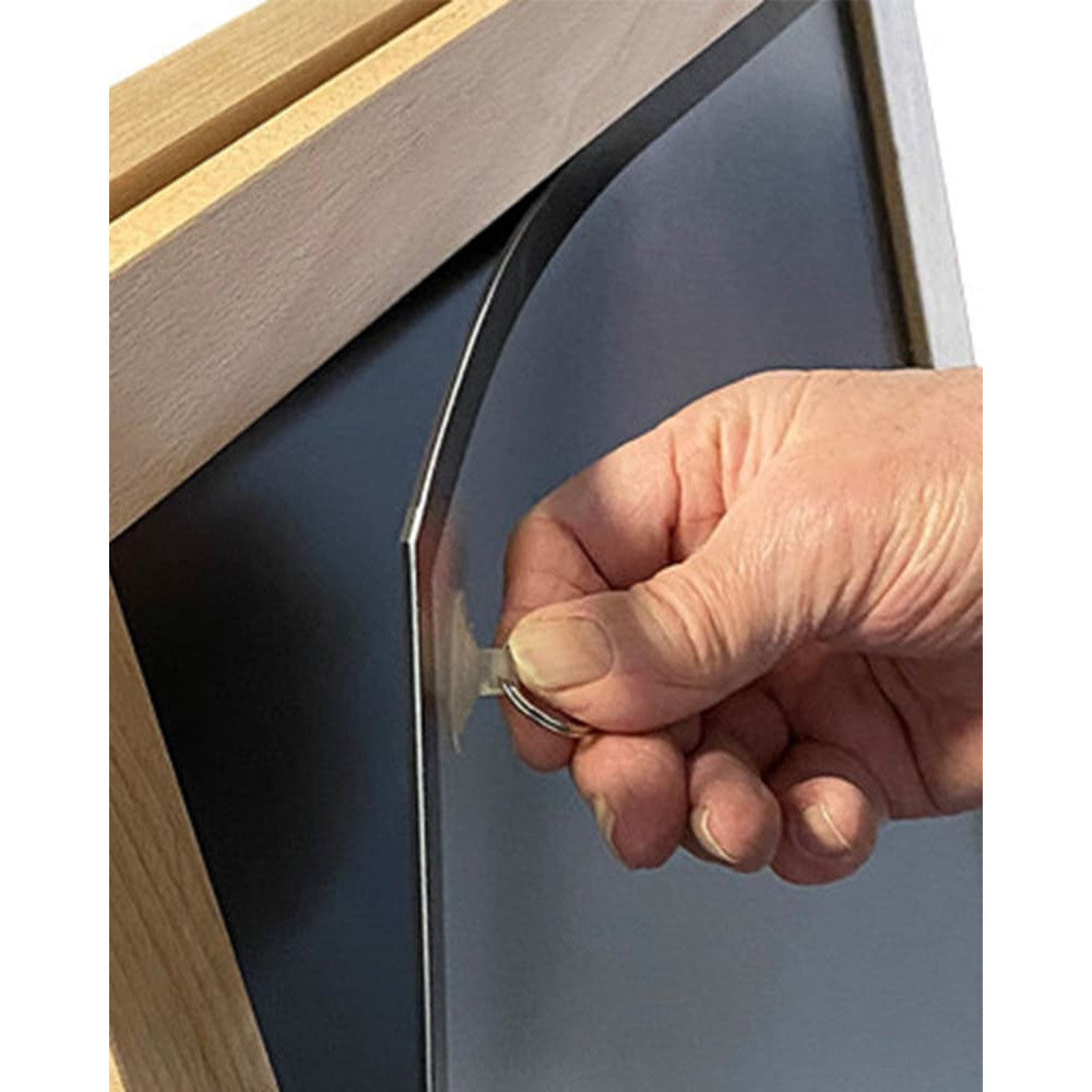 Antireflex UV-Schutzfolien mit Magnetband anbringen. Ohne Magnetfolie kann dieser Kundenstopper als herkömmlicher Holzaufsteller mit Kreide oder Kreidemarker beschriftet werden. Die abwischbare Kreidefläche aus Stahl ermöglicht ein schnelles Abwischen des Geschriebenen.