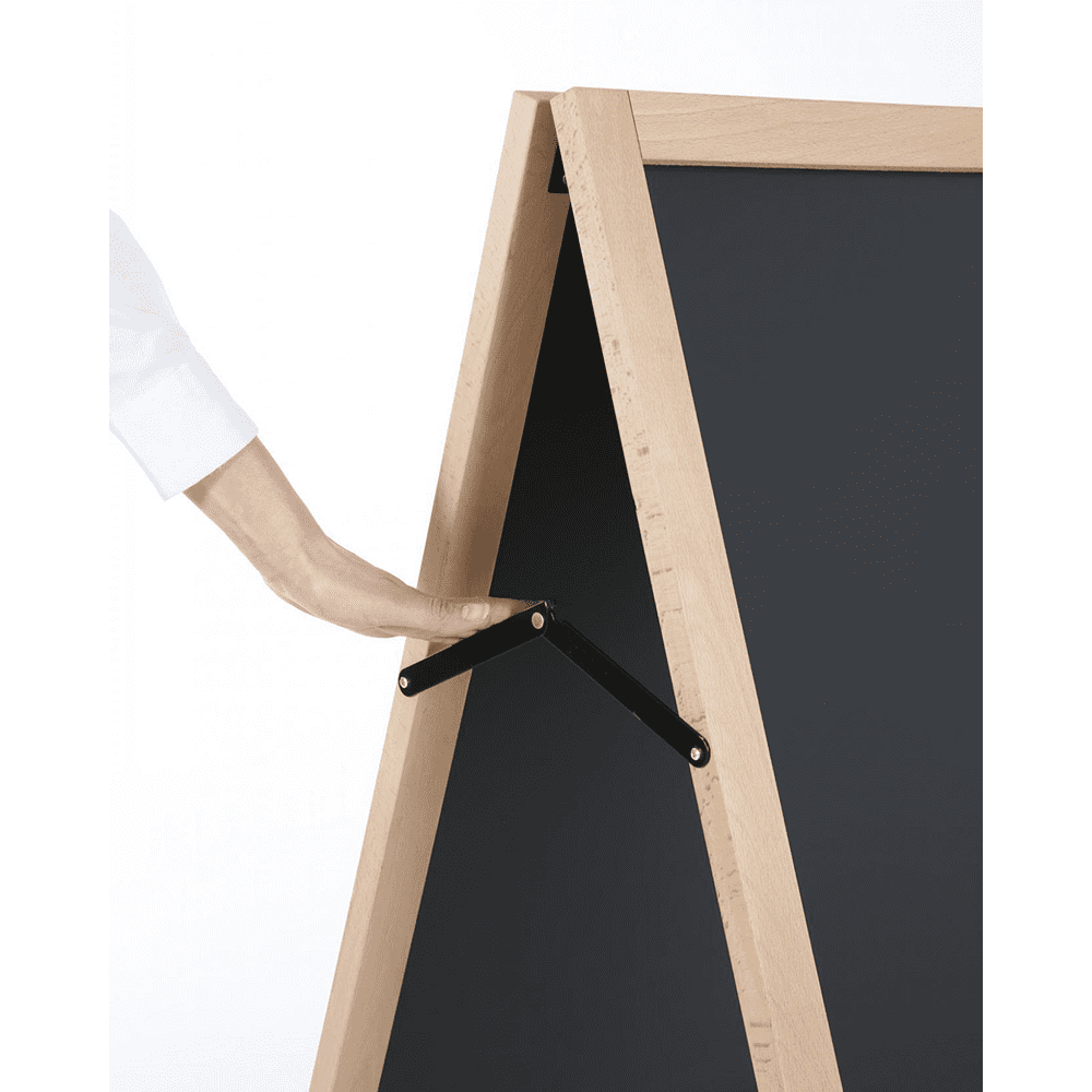 Holzaufsteller mit magnetischer Kreidetafel günstig online bestellen in der Schweiz. Dieser wetterfeste Holz Kundenstopper mit magnetischer Kreidetafel aus Stahl ist vielseitig einsetzbar. Er kann zum einen auf klassischer Art und Weise mit Kreide und Kreidemarker beschriftet werden, um beispielsweise verschiedene Menüs oder Angebot zu präsentieren. Zum Anderen können mit den mitgelieferten Magnettaschen Plakate eingefügt werden, wodurch aus dem Holzaufsteller ein Plakatständer wird. Der Holzrahmen in Buche besteht aus einer massiven Holzkonstruktion PEFC zertifiziert. Dieser Holzaufsteller wird durch stabile Scharniere und Traversen gehalten, welche die Möglichkeit bieten eine Prospektbox anzuhängen, um zusätzlich Werbung zu betreiben - ein echter Allrounder! Das Gesamtmass beträgt 624x871mm und ist optimal, um auf Gehwegen, Ladeneingängen, Restaurants, Bars, Schulen, Menzas, etc. Menüs, Werbebotschaften und vieles mehr. zu präsentieren. DIN A1 Plakate lassen sich mit unseren