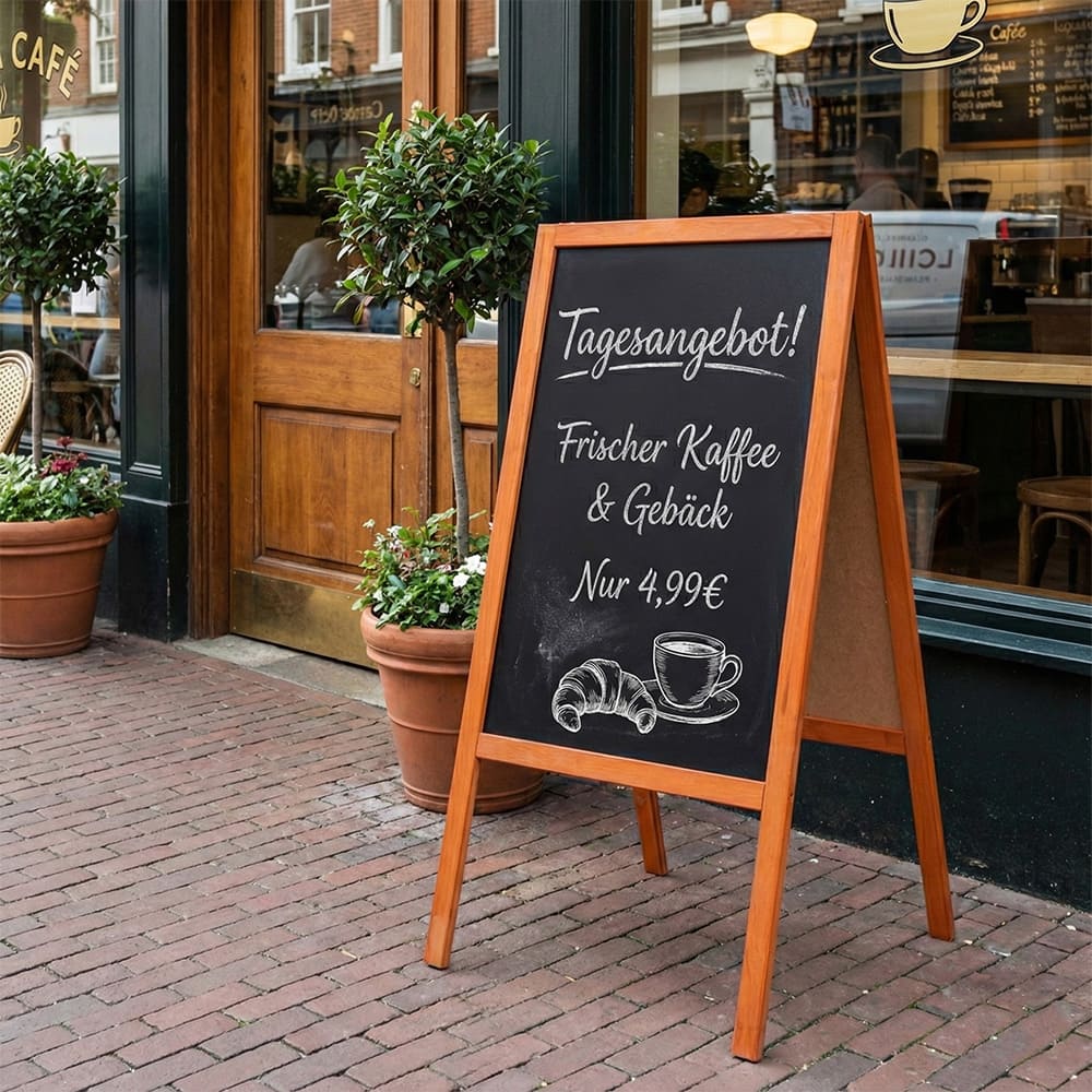 Der zweiseitige Holz Kundenstopper ist ein bewährter Klassiker für die Gastronomie, den Einzelhandel oder kreative Bereiche. Mit seiner grosszügigen Schreibfläche bietet er ausreichend Platz, um Menüs, Tagesangebote, Aktionen oder Hinweise aufmerksamkeitsstark zu präsentieren.