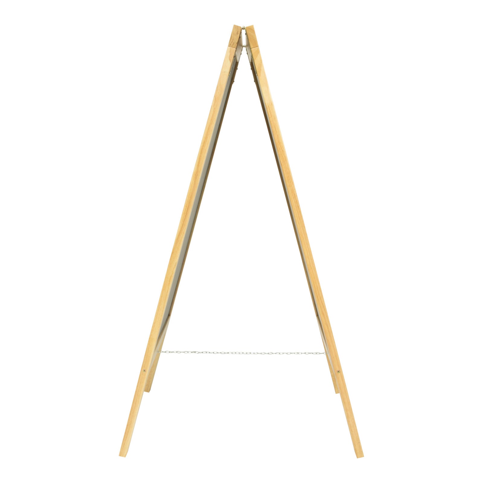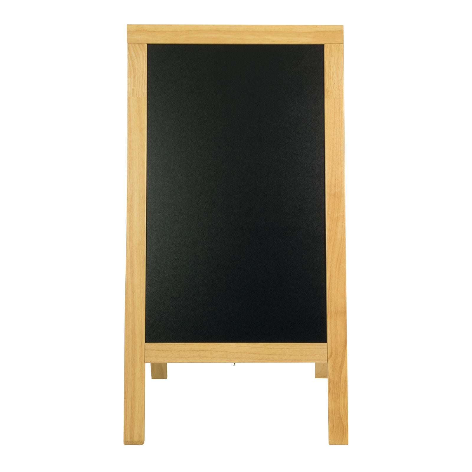 Der edle Rahmen in Buchen-Optik ist mehrfach mit einem witterungsbeständigen Schutzlack versehen und dadurch zuverlässig vor Nässe geschützt. Die schwarze Kreidetafel lässt sich flexibel mit herkömmlicher Kreide oder noch besser mit unseren Securit® Kreidemarkern beschriften. Diese Marker sind schonend für die Oberfläche, kontrastreich und langlebig – du findest sie direkt in unserem Sortiment. Eine rostfreie Abstandskette sorgt für sicheren Halt und die charakteristische A-Form des Aufstellers.