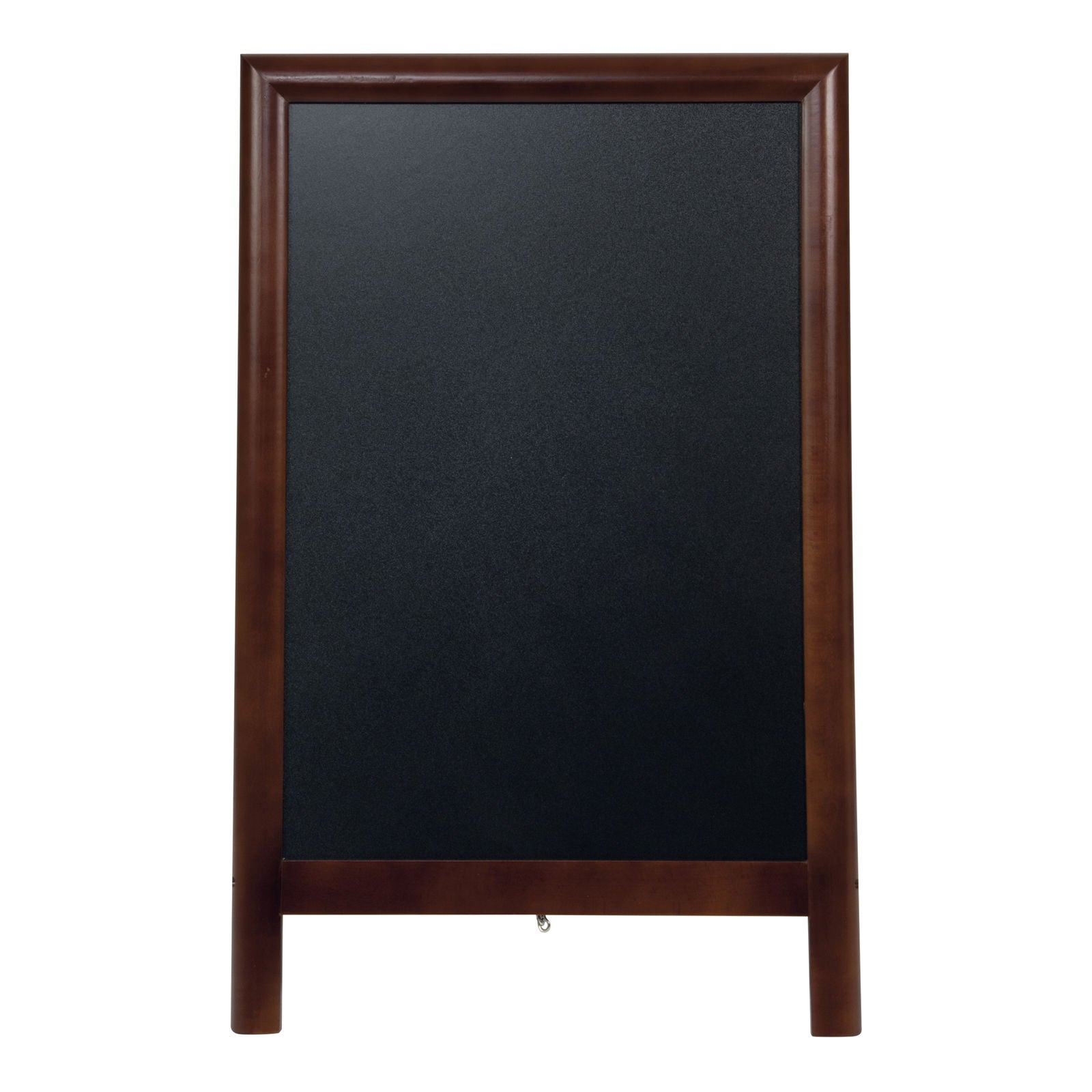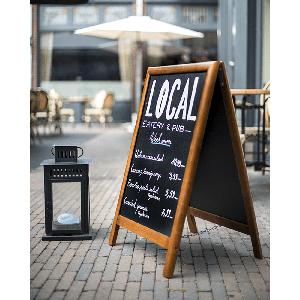 Die Edelstahl-Scharniere halten die beiden Tafelflächen sicher zusammen und formen den Aufsteller in eine stabile A-Form. Eine robuste Edelstahlkette am unteren Ende sorgt zusätzlich für die optimale Aufstelltiefe. So steht der Kundenstopper zuverlässig und macht deine Werbung sichtbar – egal ob vor Restaurants, Bars, Pubs, Bäckereien oder Schulen.