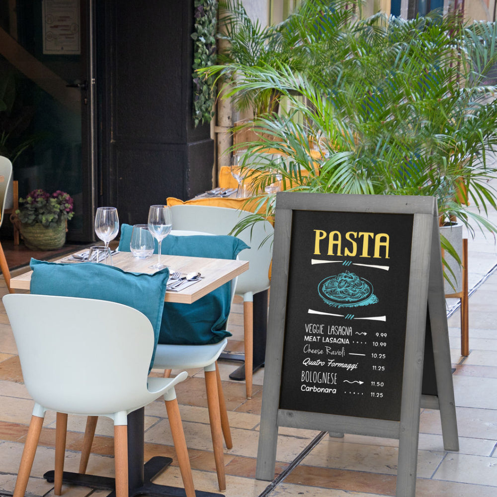 Beschriften kannst du den Aufsteller mit Kreide, Kreidemarkern oder – für besonders langlebige Lösungen – mit permanenter Klebefolie. Am auffälligsten wirken Kombinationen aus Klebefolie, zum Beispiel für ein Logo oder feste Begriffe wie „Offen“, und bunten Kreidemarkern für wechselnde Angebote. Passende Marker kannst du direkt bei uns dazubestellen. Für individuelle Folierungen stehen wir dir ebenfalls mit massgeschneiderten Angeboten zur Verfügung.