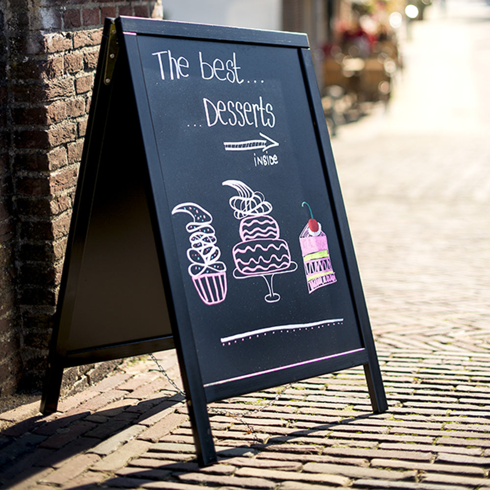 Die doppelseitige Kreidetafel bietet dir mit einer grosszügigen Schreibfläche von 47,5×67,5cm viel Platz für kreative Werbung. Am besten beschriftest du sie mit unseren Securit® Kreidemarkern, die ein kontrastreiches und modernes Schriftbild erzeugen. Von herkömmlicher Kreide raten wir ab, da sie die Schutzschicht beschädigt und das Ergebnis weniger ansprechend wirkt. Wenn du eine dauerhafte Lösung wünschst, wie etwa für Preislisten oder Öffnungszeiten, kannst du den Kundenstopper auch mit einer individuell bedruckten Folie beschriften lassen – sprich uns dafür einfach an.