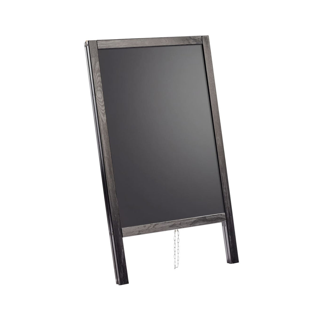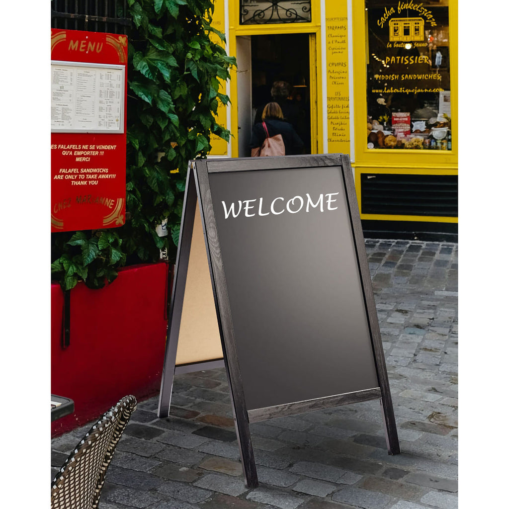 Der Aufsteller eignet sich ideal für den Innenbereich und für geschützte Aussenflächen. Die Oberfläche lässt sich sowohl mit Kreide als auch mit Kreidemarkern gestalten und bei Bedarf trocken oder feucht reinigen.