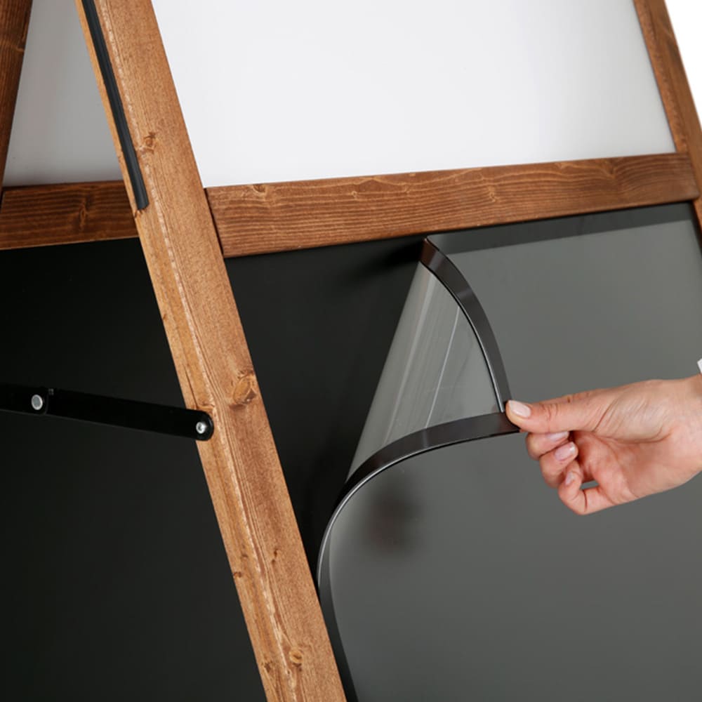 Gefertigt aus hochwertigem, PEFC-zertifiziertem Buchenholz, überzeugt der Aufsteller durch seine langlebige, wetterbeständige Konstruktion. Der dunkel lasierte Holzrahmen sorgt für eine edle Optik, während die magnetische, abwischbare Kreidetafel vielseitige Nutzungsmöglichkeiten bietet.