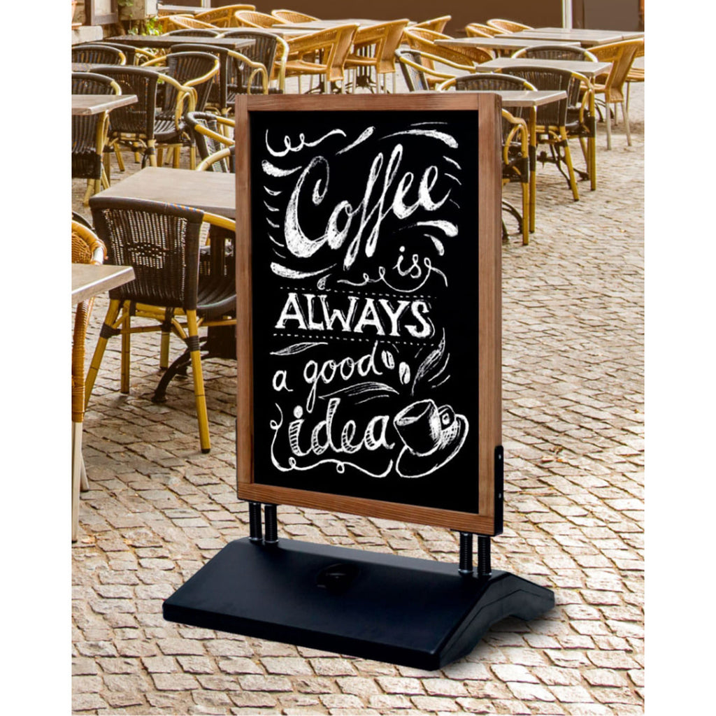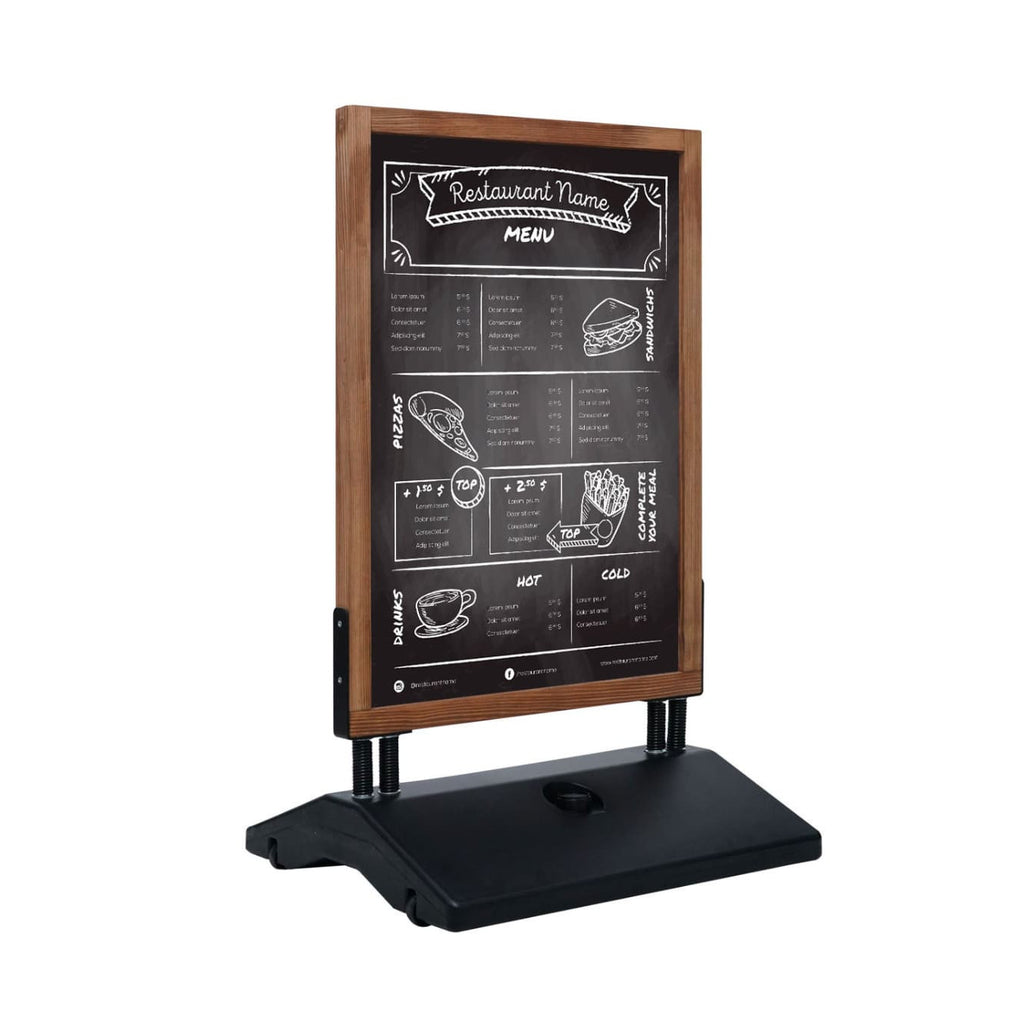 • Gesamtgrösse: ca. 110 × 70,4 cm • Schreibfläche: ca. 62,4 × 87,1 cm – passend für DIN A1 Plakate (594 × 841 mm) • Material: Holzrahmen aus Tannenholz, Tafelfläche aus MDF mit Stahlblech • Farbe: Dunkelbraun lasiert • Gewicht: unbefüllt ca. 15 kg, befüllbar mit bis zu ca. 27 l Wasser oder Sand • Anzahl Flächen: 2 (doppelseitig beschriftbar) • Anwendung: Für Innen- und Aussenbereiche, auch bei Wind geeignet • Einsatzmöglichkeiten: Für Gastronomie, Tankstellen, Einzelhandel, Schulen, Clubs, Events u. v. m. • Beschriftung: Mit Kreide, Kreidemarkern oder Magnetfolien • Reinigung: Trocken oder feucht mit Tuch/Schwamm abwischbar (ideal mit Securit Reinigungsschwamm) • Lieferumfang: 1 × zweiseitiger Kundenstopper mit Wassertank + 2 × Antireflex UV-Schutzfolien mit Magnetband