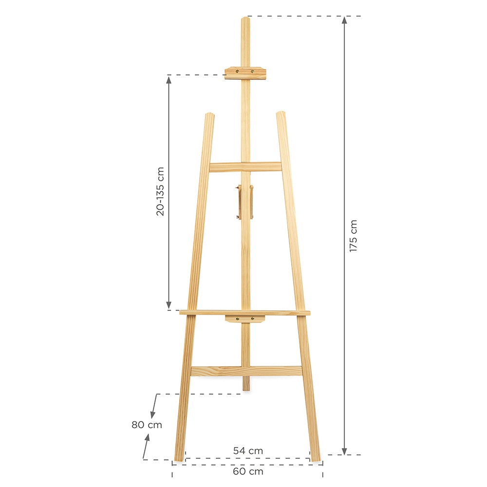 Die Holz Staffelei Classic in Naturholz ist ein unverzichtbares Werkzeug für kreative Projekte und stilvolle Präsentationen. Mit 175 cm Höhe und nur ca. 3 kg Gewicht ist sie leicht zu transportieren, schnell aufgestellt und platzsparend zu verstauen. Gefertigt aus hochwertigem, naturbelassenem Kiefernholz, überzeugt sie durch Stabilität, schlichte Eleganz und Vielseitigkeit.