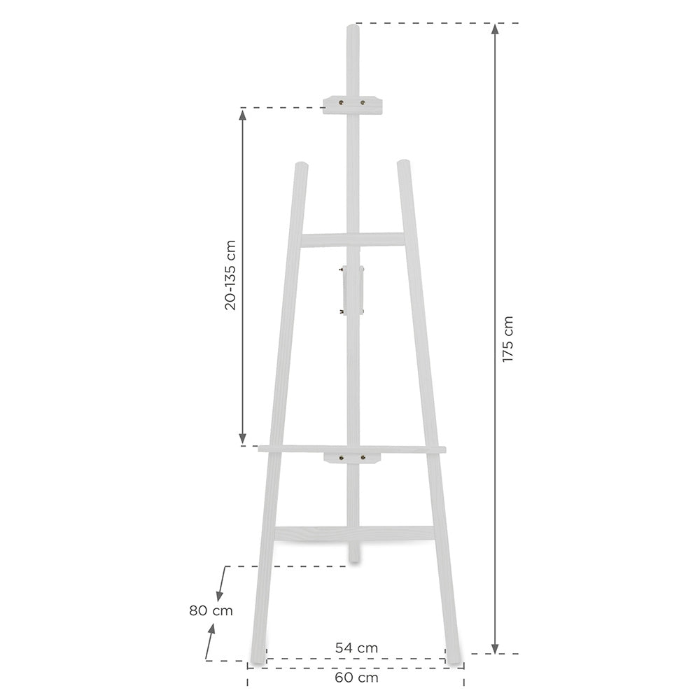 Die Holz Staffelei Classic in Weiss vereint Funktionalität und Eleganz in einem. Gefertigt aus hochwertigem Kiefernholz und mit einer strahlend weissen Lackierung versehen, eignet sie sich perfekt für Präsentationen aller Art – ob in Restaurants, Galerien, Hotels, Schulen, Universitäten oder auf Hochzeiten. Mit ihrer Höhe von 175 cm setzt sie Tafeln, Bilder und Leinwände stilvoll in Szene und wird schnell zum Blickfang.