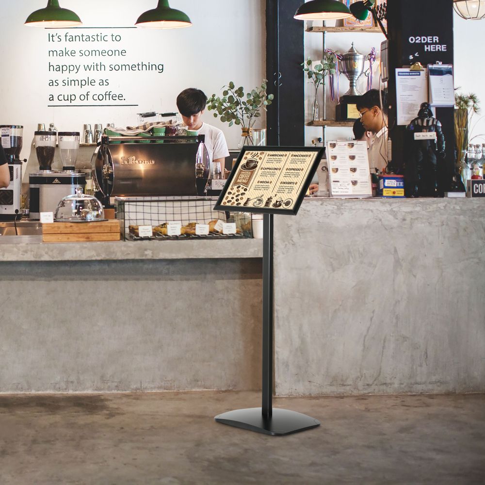 • Design: Moderner, gewölbter Standfuss – eleganter als der klassische Infoständer