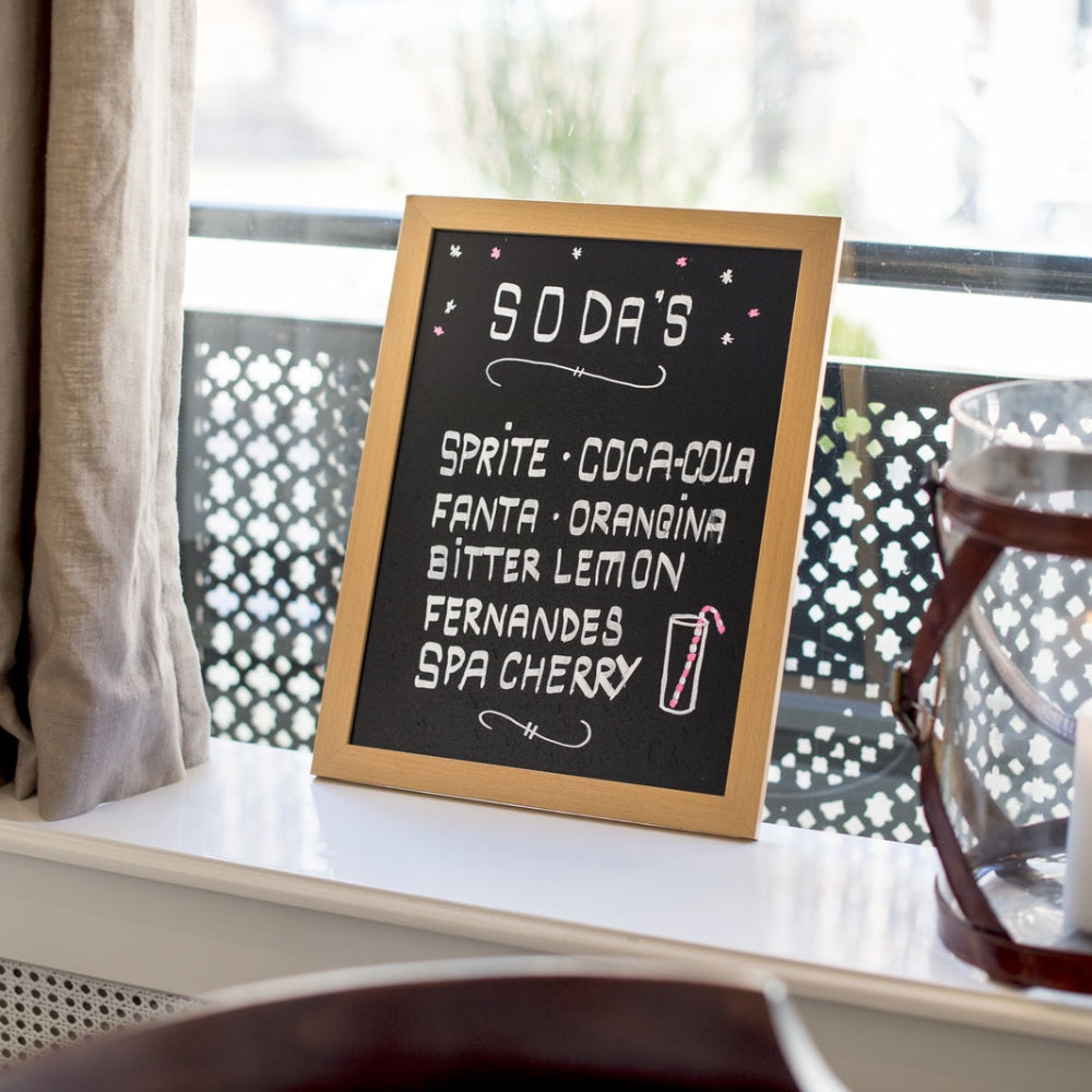 Die Tafel lässt sich sowohl aufstellen als auch aufhängen und bietet dir vielseitige Beschriftungsmöglichkeiten. Du kannst sie mit herkömmlicher Kreide, Kreidemarkern oder auch mit Folien für dauerhafte Inhalte nutzen. Durch ihre mittlere Grösse passt sie in viele Einsatzbereiche – perfekt als Menütafel, Infotafel oder dekoratives Element zuhause.