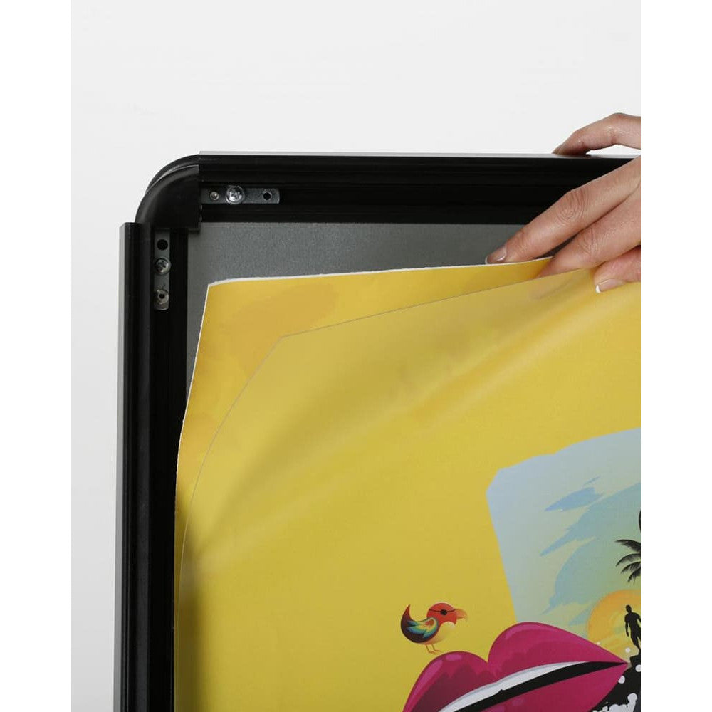Dank der praktischen Klapprahmentechnik ist der Plakatwechsel in wenigen Sekunden erledigt. Die mitgelieferten Antireflex-UV-Schutzfolien schützen deine Werbung vor Sonneneinstrahlung und machen sie stets gut sichtbar. Für den dauerhaften Einsatz draussen empfehlen wir wasser- und wetterfeste PVC-Plakate, die du direkt bei uns mitbestellen kannst.