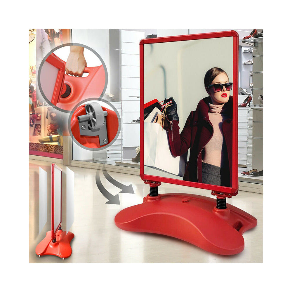 Setze deine Angebote gekonnt in Szene mit dem roten Kundenstopper Alu Classic mit Wassertank. Dieser doppelseitige Werbeständer im Format DIN A1 (594×841 mm) zieht in Einkaufspassagen, vor Läden oder auf Gehwegen sofort die Blicke auf sich und macht deine Aktionen und Rabatte sichtbar.