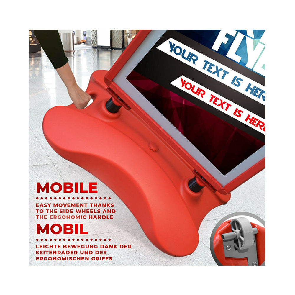 Der integrierte Wassertank lässt sich mit Wasser oder Sand befüllen und bringt das Gewicht auf bis zu 40 kg – so bleibt dein Plakatständer auch bei Wind stabil stehen. Trotz der robusten Bauweise bleibt er dank seitlich montierter Rollen mobil und lässt sich leicht von A nach B bewegen.