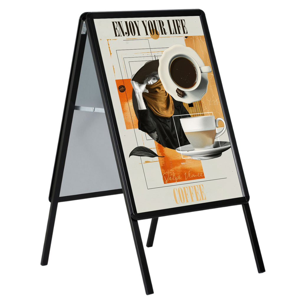 Mit dem Kundenstopper Alu Classic Black weckst Du garantiert die Aufmerksamkeit von Passanten. Der edel schwarz lackierte Aluminiumrahmen setzt Dein Plakat wirkungsvoll in Szene und hebt sich deutlich von der Masse ab. Ob im Einzelhandel, in der Gastronomie oder auf Messen – dieser Plakatständer überzeugt durch seine Stabilität, den schnellen Motivwechsel und die elegante Optik.