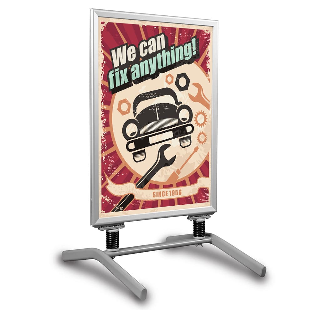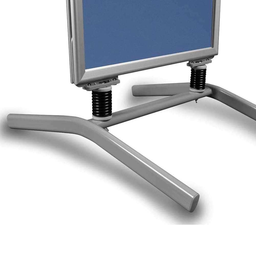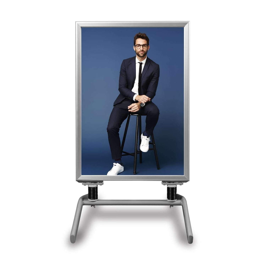 Der auf Federn gelagerte Aluminiumrahmen schwingt bei Wind, anstatt umzufallen – so bleibt dein Plakat auch bei stärkerem Wetter gut sichtbar. Die robusten Standbeine sorgen für sicheren Halt, während der 32 mm breite Klapprahmen einen schnellen und unkomplizierten Plakatwechsel ermöglicht.