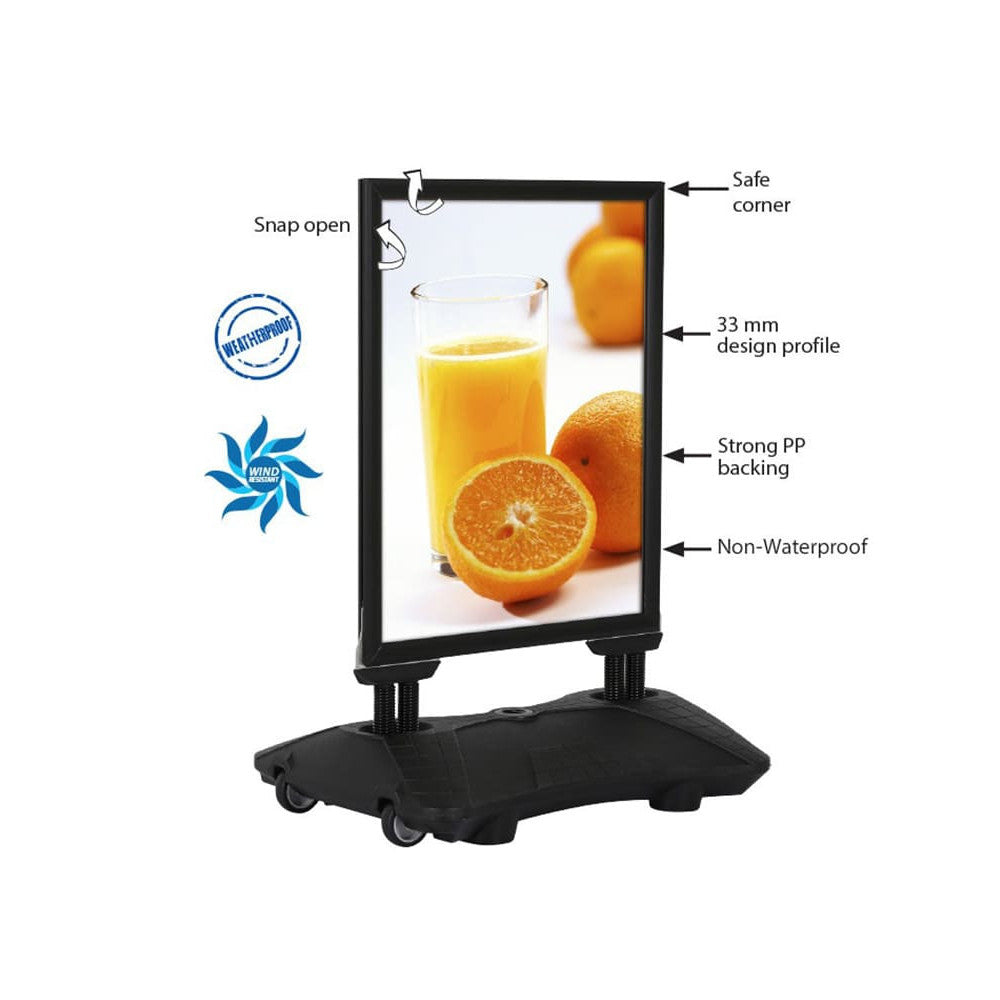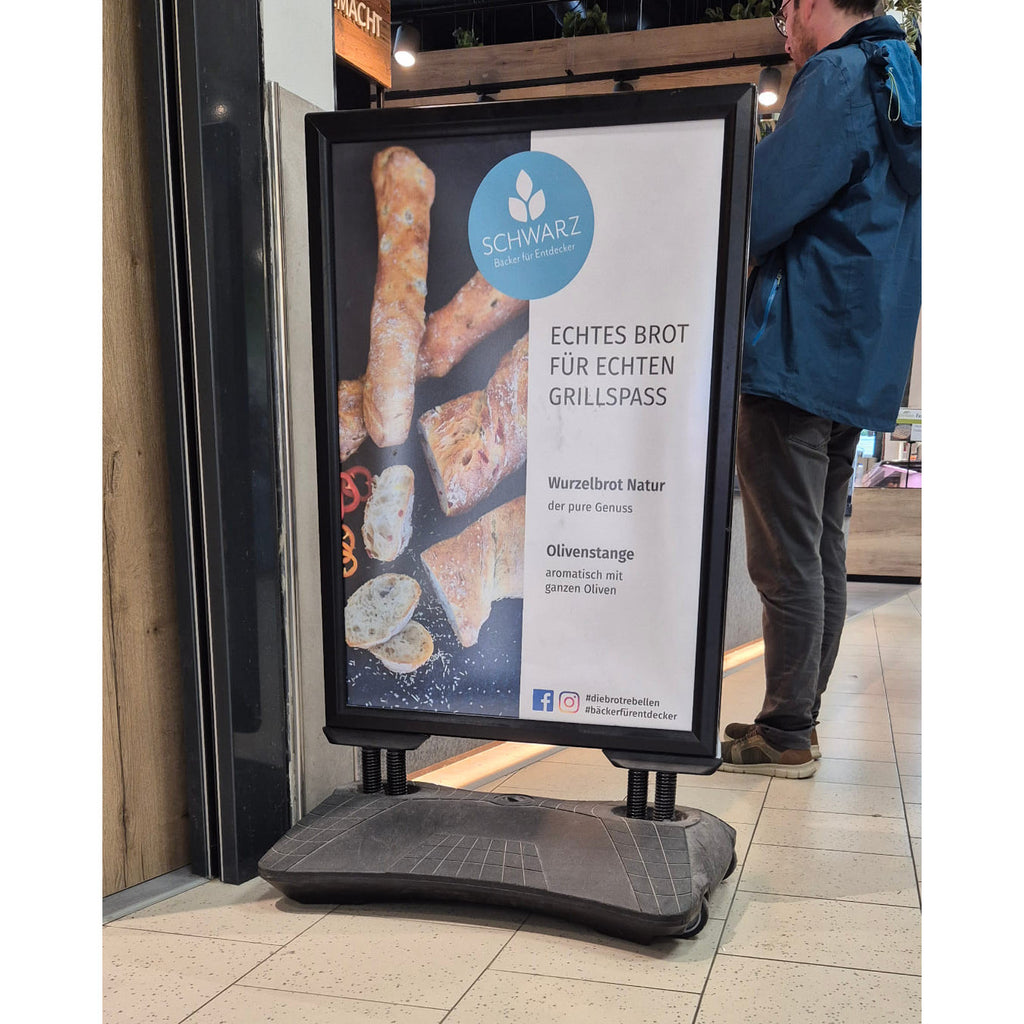 • Windfester Kundenstopper aus Aluminium in edlem Schwarz • Wetter- und UV-beständig – ideal für den Aussenbereich • Klapprahmen (33 mm) auf vier Seiten aufklappbar für schnellen Plakatwechsel • Beidseitige Werbefläche – doppelte Sichtbarkeit Ihrer Botschaft • Antireflex-UV-Schutzfolien im Lieferumfang enthalten • Stabiler, rollbarer Wassertank für hohe Standfestigkeit und leichte Mobilität • In den Formaten DIN A0, DIN A1, B1 und B2 erhältlich • Ideal für Strassenwerbung, Gastronomie, Einkaufszentren, Tankstellen & Events