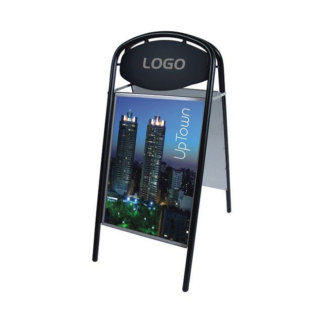 Schwerer und doppelseitiger Kundenstopper aus wetterfestem 32mm Stahlrohr, erhältlich in schwarz. Dieser Kundenstopper kommt vor allem im Aussenbereich zum Einsatz, weil er dank den magnetischen Antireflex UV-Schutzfolien die Plakate vor eindringender Nässe schützt. Dank seinem polyesterlackierten und phosphatierten Stahlrohr ist er gegen Wind und Wetter äusserst standhaft! Meist wird dieses schwere Modell von unseren Kunden im Einzelhandel verwendet, doch er kann für verschiedenste Zwecke eingesetzt werden, wie etwa für politische Anlässe, Messen, Vereinen, etc. Durch das oben integrierte Logoschild lässt sich das eigene Logo vom Inhalt hervorheben, um eine höhere Werbewirkung erzielen. Das Logoschild kann mit einer Folie beklebt werden, die wir auf Anfrage für Sie produzieren können.