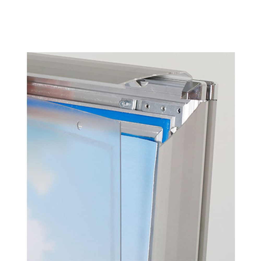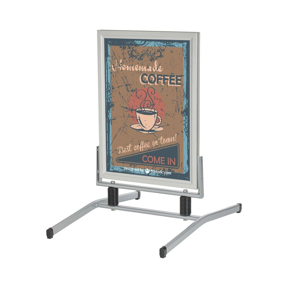 Dieses wetterfeste Kundenstopper ist ideal als Werbefläche auf windigen Strassen im Freien, an stark frequentierten Strassen, Passantenwegen, etc. geeignet. Mit seinem 44mm Klapprahmenprofil und der integrierten Gummidichtung ist er gegen das Eindringen von Wasser bestens geschützt. Dieser Strassenständer wird in drei verschiedenen Formaten geeignet, wobei das Format DIN A1 am meisten gekauft wird. Wenn es etwas auffälliger sein soll, dann empfehlen wir das Format B1 (70x100cm). Am unteren Ende der Plakatfläche sind starke Stahlfedern angebracht, welche die Plakatfläche und die langen Füsse zusammenhalten.