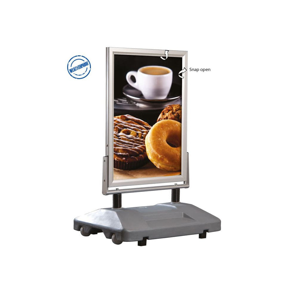 Kundenstopper Windmaster mit Wassertank ist die erste Wahl in Sachen strumfester Strassenständer. Ob auf Gehwegen, am Strassenrand an stark befahrenen Autostrassen, Raststätten, uvm. Dieser stabile Kundenstopper mit auffüllbarem Wassertank ist extrem standfest bei Wind und Wetter. Das 45mm breite Klapprahmen-Profil ist besonders hochwertig verarbeitet und sorgt für einen optimalen Halt Ihrer Poster/Plakate, auch bei regnerischem Wetter. Dieser Strassenständer wird inklusive zwei Antireflex UV-Schutzfolien mitgeliefert, die nach Aufklappen der Profile entfernt werden können, damit die Plakate eingelegt werden könne. Die Gummidichtung am Hauptrahmen schützt zusätzlich vor eindringender Nässe. Der Wassertank kann mit Wasser oder Sand aufgefüllt werden, damit das Maximum an Stabilität erreicht werden kann. Damit der schwere Kundenstopper trotzdem gut transportieren kannst, sind am unteren Ende des Tankfusses zwei Rollen angebracht. Wenn man den Strassenaufsteller seitlich neigt, lässt er sich gut von A nach B transportieren.