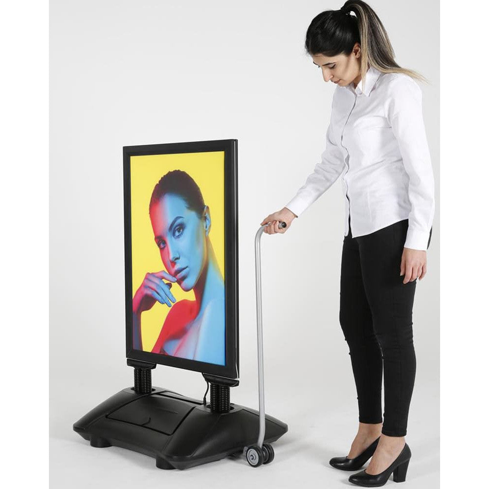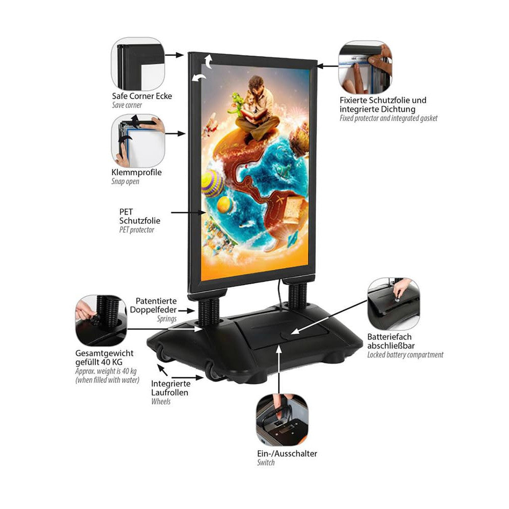 Mit diesem LED-Plakatständer für aussen erhöhen Sie die Aufmerksamkeit für Ihre Werbebotschaft deutlich – ob tagsüber oder bei Dunkelheit. Der doppelseitige Aufbau ermöglicht eine Rundum-Wirkung, die auch aus der Entfernung überzeugt. Robust, energieeffizient und einfach zu bedienen – der WindPro® LED Economy ist der ideale LED Kundenstopper für den Aussenbereich.