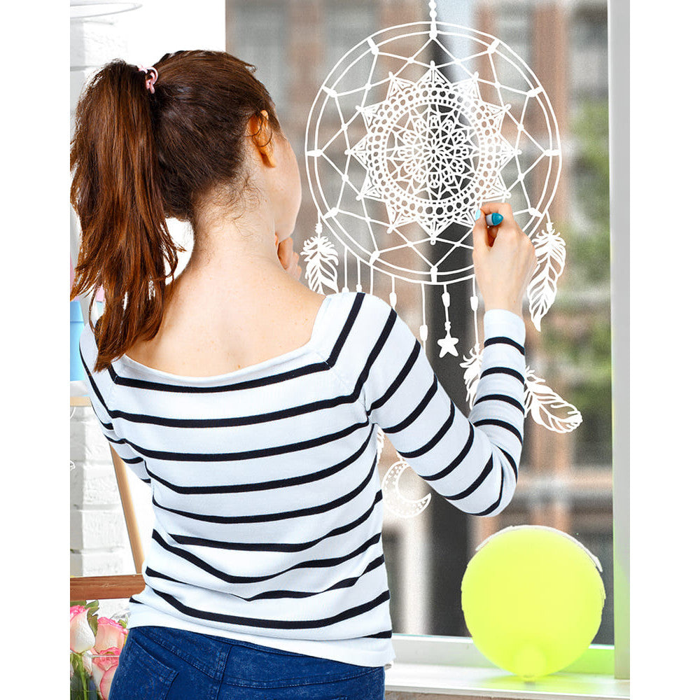 Marke: Securit® Verpackungseinheit: 3er Set Schablonen, Thema Home & Traumfänger Anwendung: Geeignet zum Nachzeichnen auf Fenster, Kundenstopper, Kreidetafeln, Boards, etc. mit coolen Home & Traumfänger Motiven