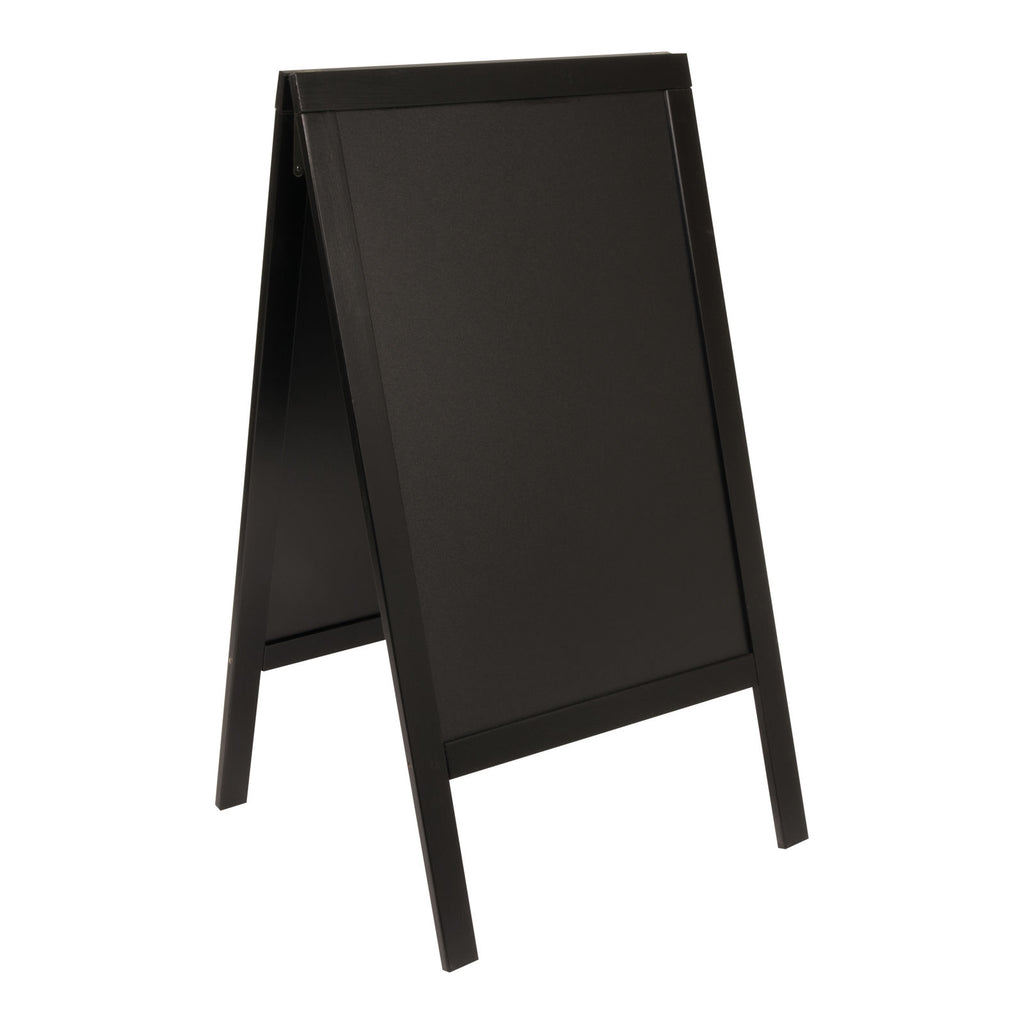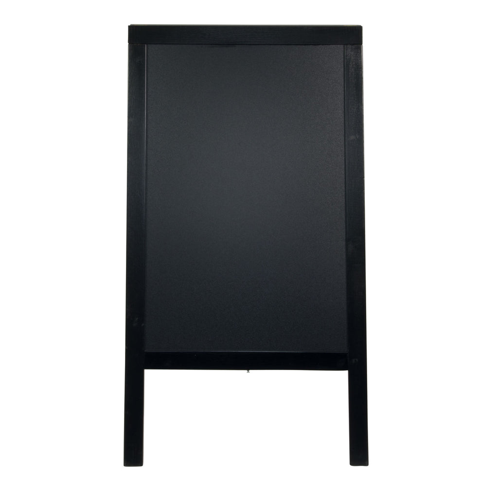 Der Holzrahmen ist mehrfach mit witterungsbeständigem Schutzlack behandelt und überzeugt durch seine elegante, tiefschwarze Optik. Die beiden beschriftbaren Flächen sind stabil miteinander verbunden und werden durch eine Abstandskette fixiert, die für eine sichere A-Form und optimale Aufstelltiefe sorgt. Dank der grosszügigen Fläche von 58 x 88 cm hast du reichlich Platz für deine individuellen Werbebotschaften.
