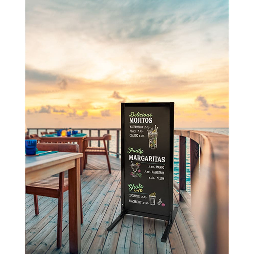 Elegante Securit® Kreidetafel mit Holzrahmen schwarz und T-Fuss Beinen, damit Sie nahezu überall platziert werden kann.