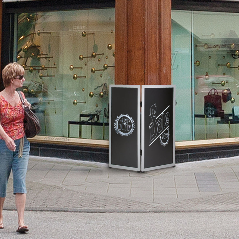 Durch die glatte Verarbeitung auf Vorder- und Rückseite sowie den mitgelieferten Verbindungssatz kannst du das Multiboard nicht nur einzeln einsetzen, sondern auch mit weiteren Tafeln kombinieren. So entsteht auf Wunsch eine grössere Werbefläche oder ein flexibler Raumtrenner, der gleichzeitig deine Botschaften sichtbar macht.