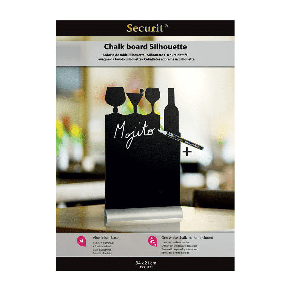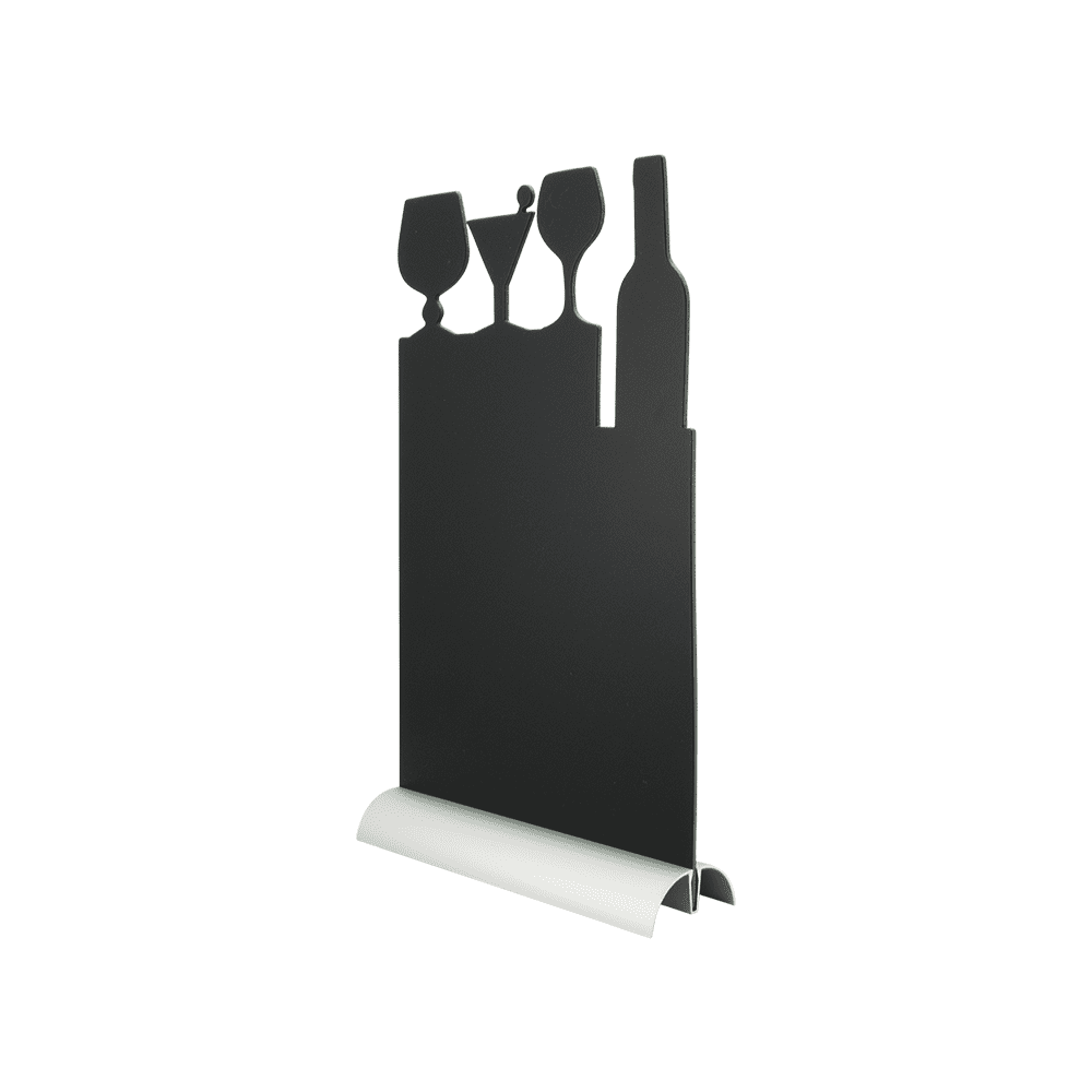 Kreative Tischtafel mit verschiedenen Cocktail Gläsern und einem Aluminiumsockel zum positionieren auf Tischen. Ob in Restaurants, Bäckerei, Konditorei, etc. Dieser Tischkreidetafel-Aufsteller mit Aluminiumfuss ist ein echter Hingucker für alle Gastronomen, um Preise von frischen Cocktails zu präsentieren. Die schwarze Melamin-Kreidetafel-Silhouette ist mit Kreide und Kreidemarker beschriftbar. Damit Sie nach der Lieferung mit der Beschriftung gleich loslegen können, ist ein weisser Kreidemarker 1-2mm inbegriffen. Weiteres passendes Zubehör für die Beschriftung können Sie