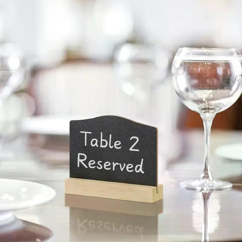 Mit dem stabilen Holzsockel und der handlichen Grösse von 10×8 cm sind diese kleinen Tafeln ideal, um Menüs, Preise, Namen oder kurze Notizen stilvoll zu präsentieren.