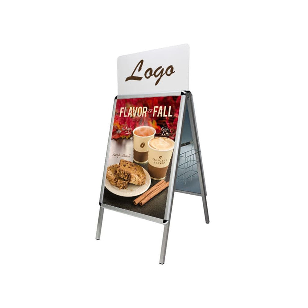 Weisses Topschild & Halterung für Kundenstopper Alu Classic kaufen und Ihr Logo oder Ihre Werbebotschaft auffälliger präsentieren. Das weisse Topschild besteht aus 3mm stabilem Hart-PVC Schaum und lässt sich mit Folie sehr gut beschriften. Die Metallhalterung kann von oben eingeführt werden, indem man den Plakatständer zuerst zuklappt, damit der Spalt oben grösser wird. Wenn man die Halterung eingeführt hat, so muss man dafür sorgen, dass die beiden Bolzen unter den Scharnieren gelangen, damit die Halterung oben und unten fixiert ist. Hat man die Metallhalterung positioniert, so kann das Topschild von oben in die Halterung eingeführt werden.