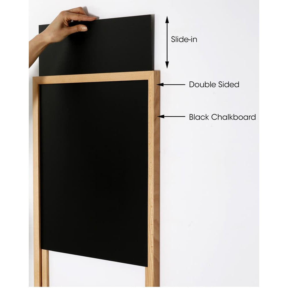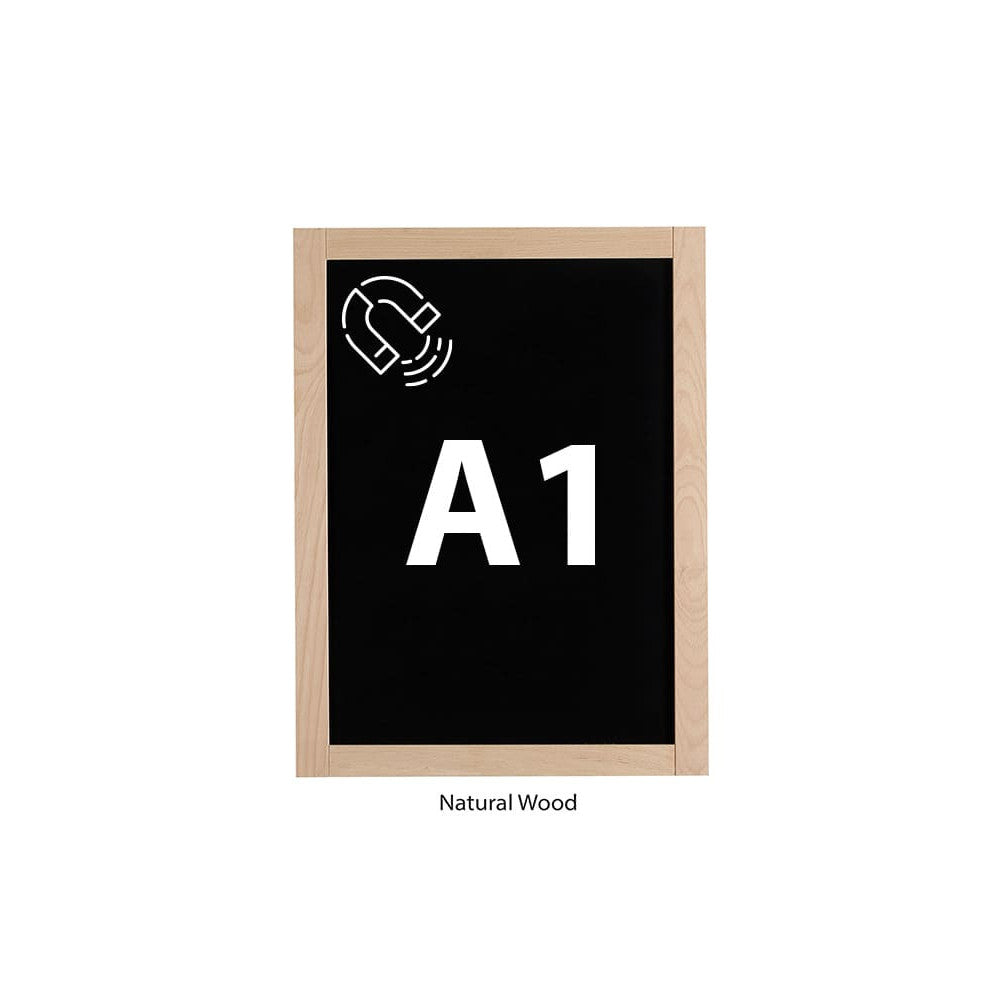 Kreidetafel magnetisch mit naturbelassenem Holzrahmen. Ob in Schulen, Restaurants, Bars, Büros, etc. - Diese magnetische Wandkreidetafel kann sehr vielfältig eingesetzt werden, z.B. als Menütafel, einladende Sprüche, Notizen, Pinnwand, und vieles mehr. Diese Wandtafel kann mit herkömmliche Kreide, Kreidemarker, Folie, Magnetpins oder mit Magnetfolie beschriftet werden. Um Sie leichter beschriften zu können, kann die Slide-In Tafel (Einschubtafel herausnehmbar) entfernt werden. So kann sie entweder selbst beschriftet- oder dem Werbetechniker leichter mitgeben werden. Das Gesamtmass beträgt ca. 68.1x92.8cm und die beschriftbare schwarze Tafel beträgt DIN A1 (594x841mm), dem Topseller Format. Kreidemarker und weiteres passendes Zubehör können Sie
